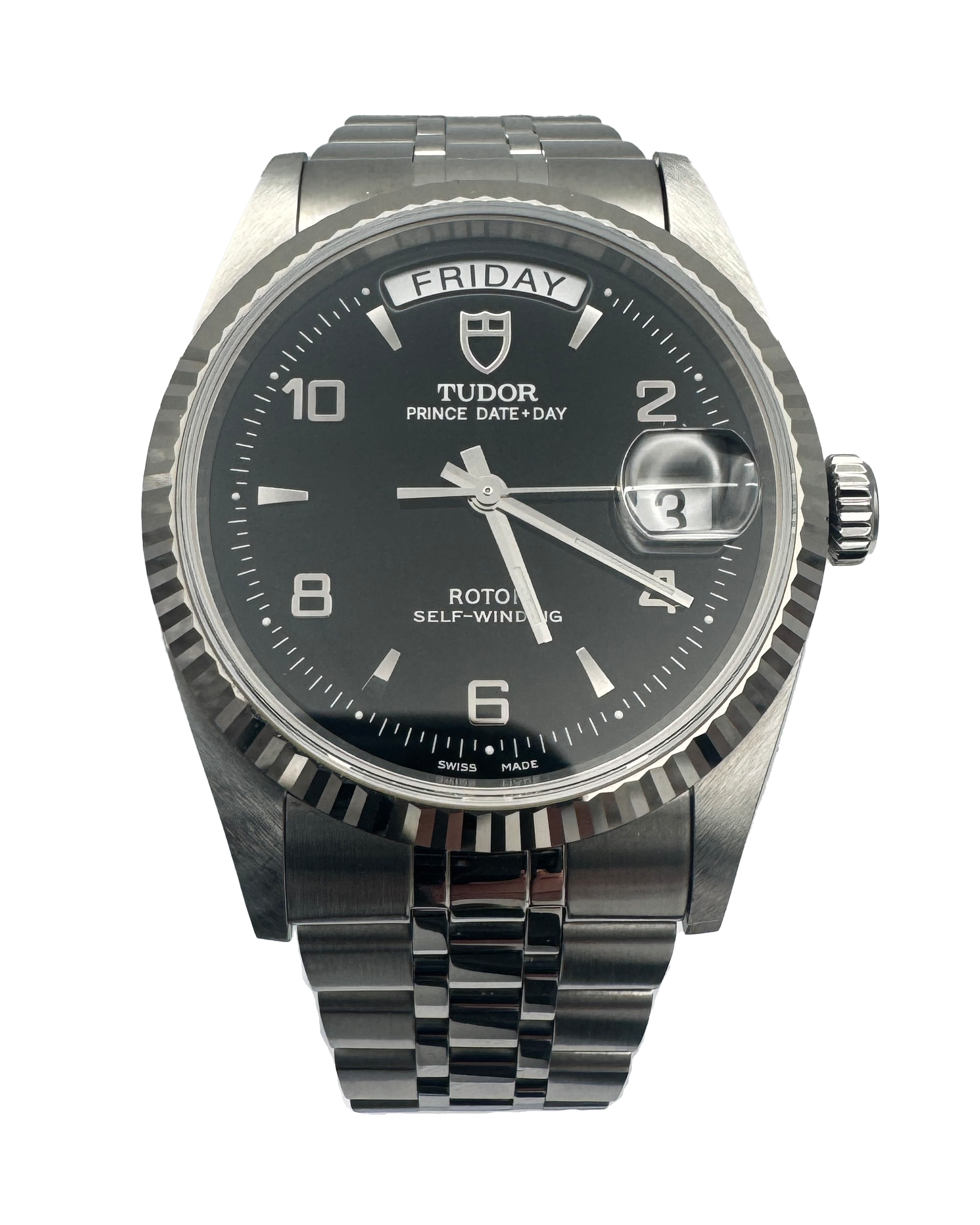 Tudor Prince Date+Day Black Dial 36mm President wristwatch in silver Ref. 76214: